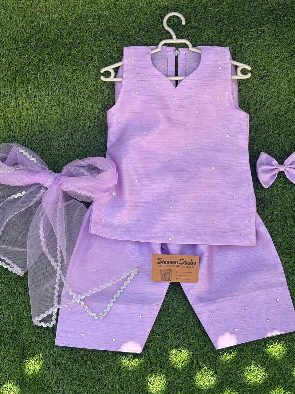 The shirt features a stylish bow design with hand-embellished stones, paired with a traditional farshi shalwar that adds a graceful festive touch. The outfit is completed with a delicate laced dupatta and a matching hairpin to create the perfect Eid look.